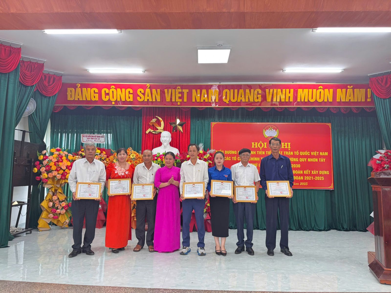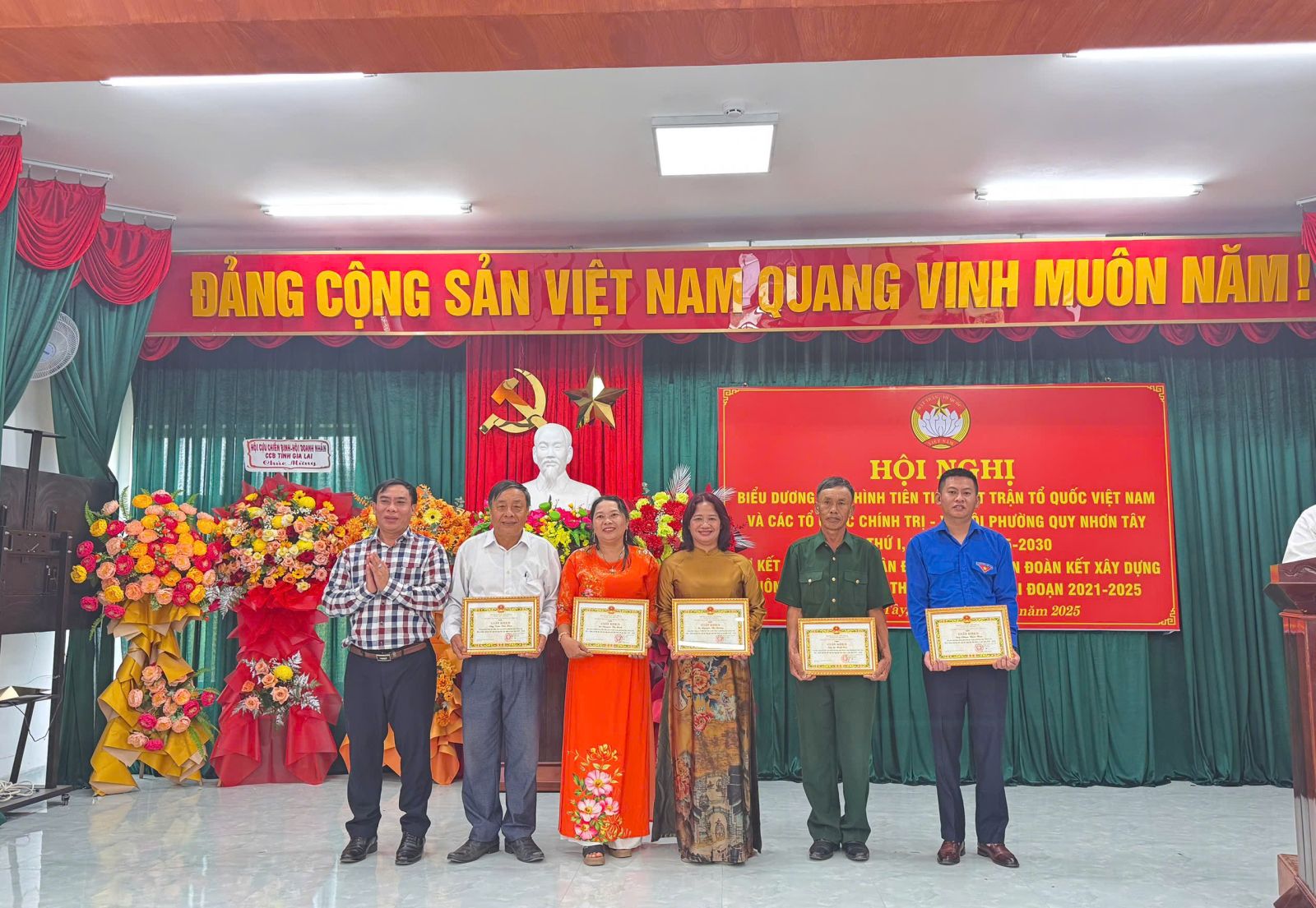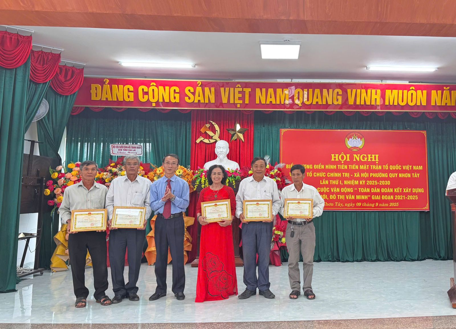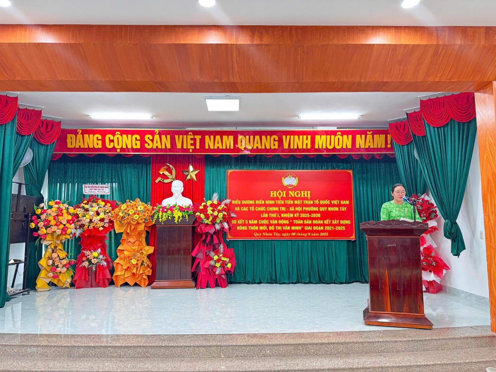 Sáng ngày 09 tháng 9 năm 2025, tại Hội trường cơ quan Đảng Ủy phường Quy Nhơn Tây. Uỷ ban Mặt trận Tổ quốc Việt Nam phường đã long trọng tổ chức Hội nghị biểu dương điển hình tiên tiến lần thứ I, giai đoạn 2025 - 2030 và Sơ kết 5 năm Cuộc vận động “Toàn dân đoàn kết xây dựng nông thôn mới, đô thị văn minh” giai đoạn 2021-2025. Về tham dự Hội nghị, có Đồng chí Hoàng Thị Thanh Nhã - Trưởng ban Tuyên giáo - công tác xã hội và quần chúng Ủy ban MTTQ Việt Nam Tỉnh; Đồng chí Trần Văn Đúng - Phó Bí thư Thường trực Đảng ủy phường, cùng các đồng chí trong Thường trực HĐND, UBND, lãnh đạo Ban Xây dựng Đảng, Ủy ban kiểm tra Đảng ủy, Ủy viên Ủy ban MTTQ Việt Nam phường, đại diện các ban ngành, đoàn thể, các tập thể, cá nhân điển hình. Đây là sự kiện chính trị có ý nghĩa quan trọng, nhằm đánh giá kết quả thực hiện các phong trào thi đua yêu nước và 5 nội dung Cuộc vận động “Toàn dân đoàn kết xây dựng nông thôn mới, đô thị văn minh”.
