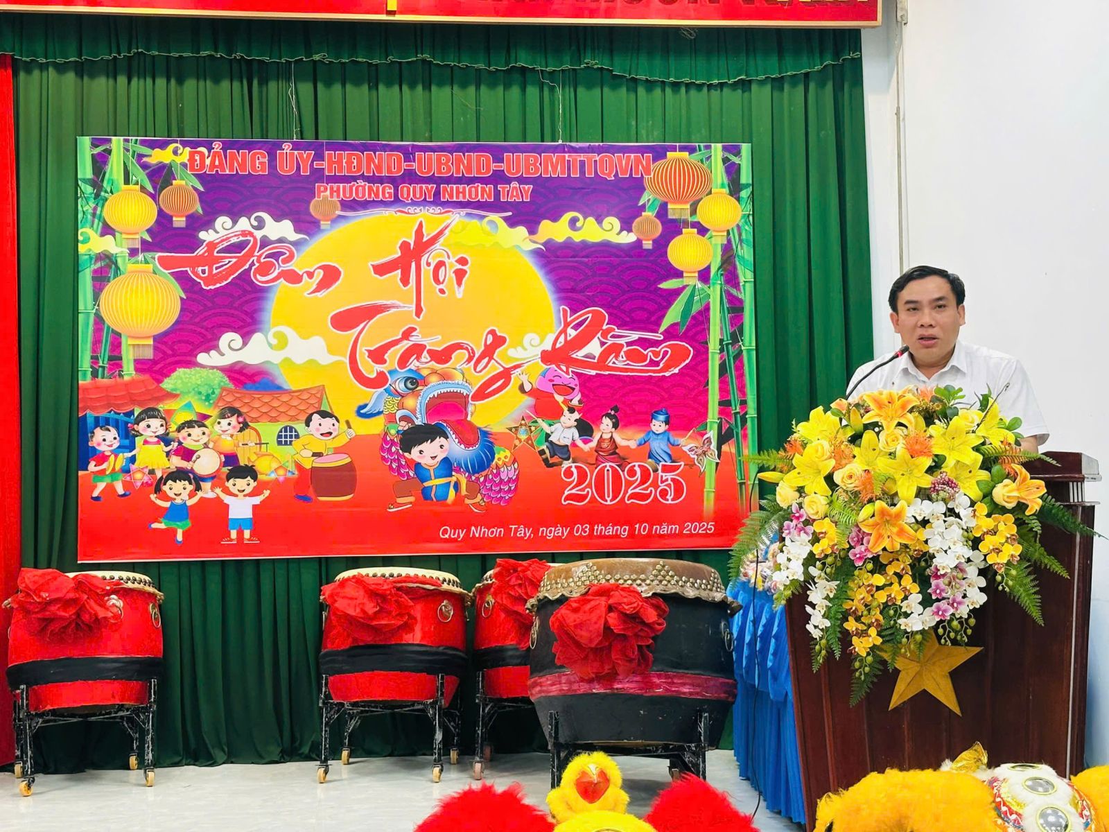 Hòa chung không khí vui Tết Trung thu trên khắp cả nước, tối ngày 03/10/2025 (nhằm ngày 12/8 âm lịch), Đảng ủy – HĐND – UBND – Ủy ban MTTQ Việt Nam phường Quy Nhơn Tây đã long trọng tổ chức chương trình “Đêm hội Trăng rằm” dành cho các em thiếu nhi có hoàn cảnh khó khăn trên địa bàn phường.